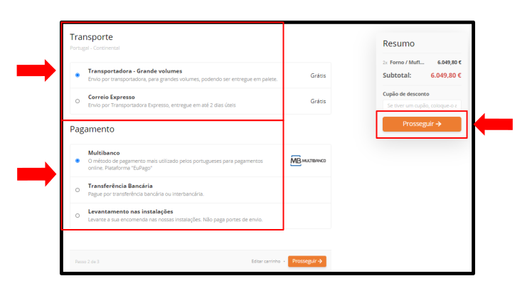 Escolha a opção de Transporte, Método de Pagamento e clique em "Prosseguir"