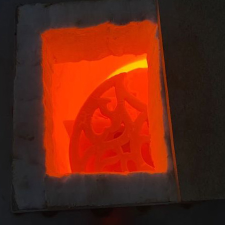 As peças são então retiradas do forno ainda incandescentes com ajuda de uma tenaz própria, banhadas em água fria, brusca ou lentamente, consoante o efeito pretendido pelo artista.