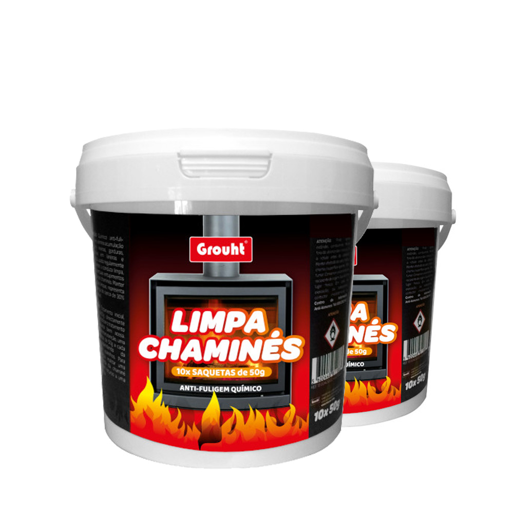 Químico anti-fuligem que previne e elimina acumulação de fuligem, resinas, gorduras, inscrostações em lareiras e salamandras.