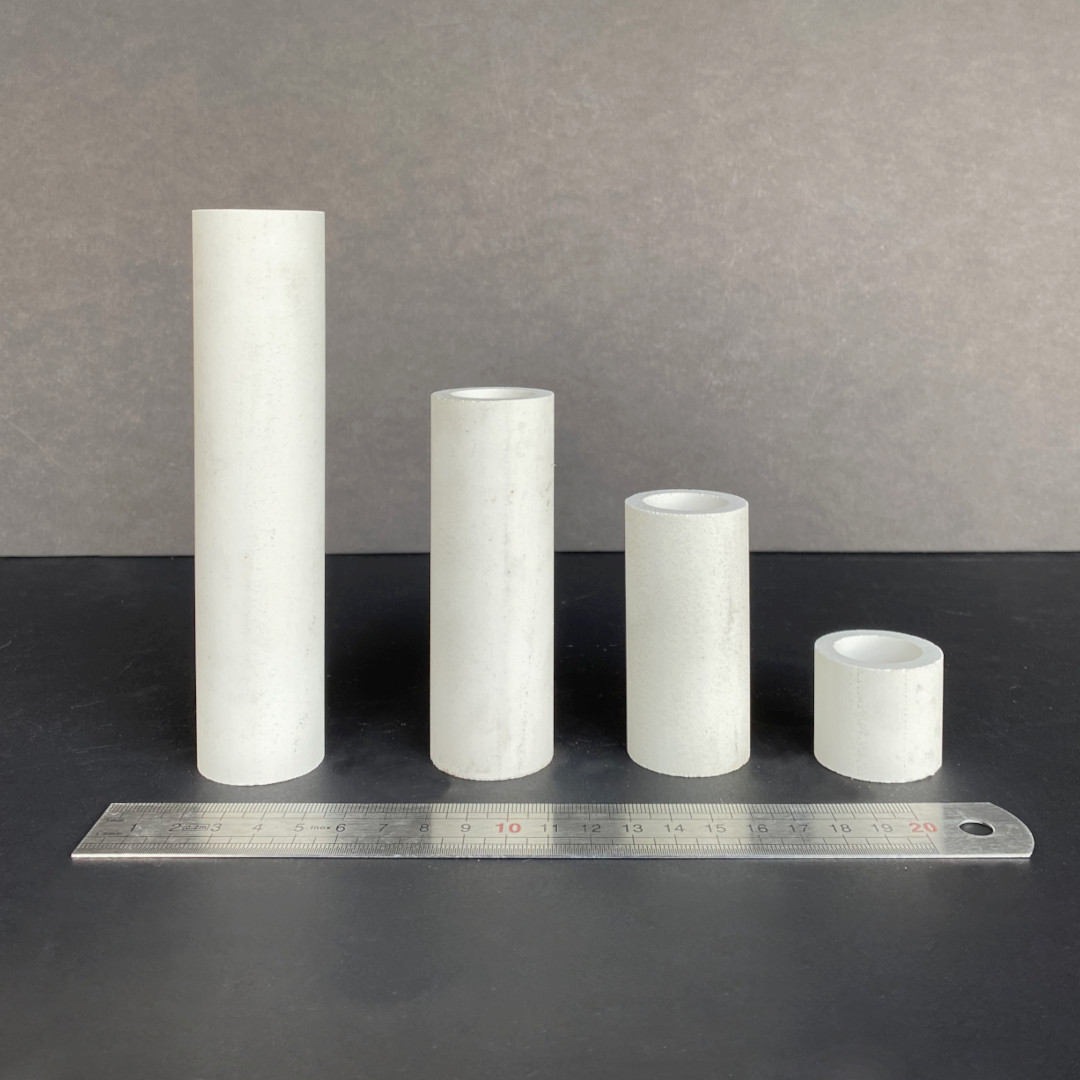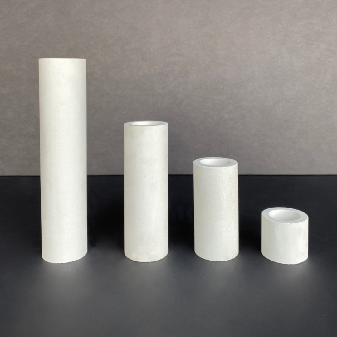 Prumos de suporte para forno e mufla em mulita (material de alta alumina) com resistência até 1400°C, disponível em 3 diâmetros e em várias alturas, de 3 a 25 cm.
